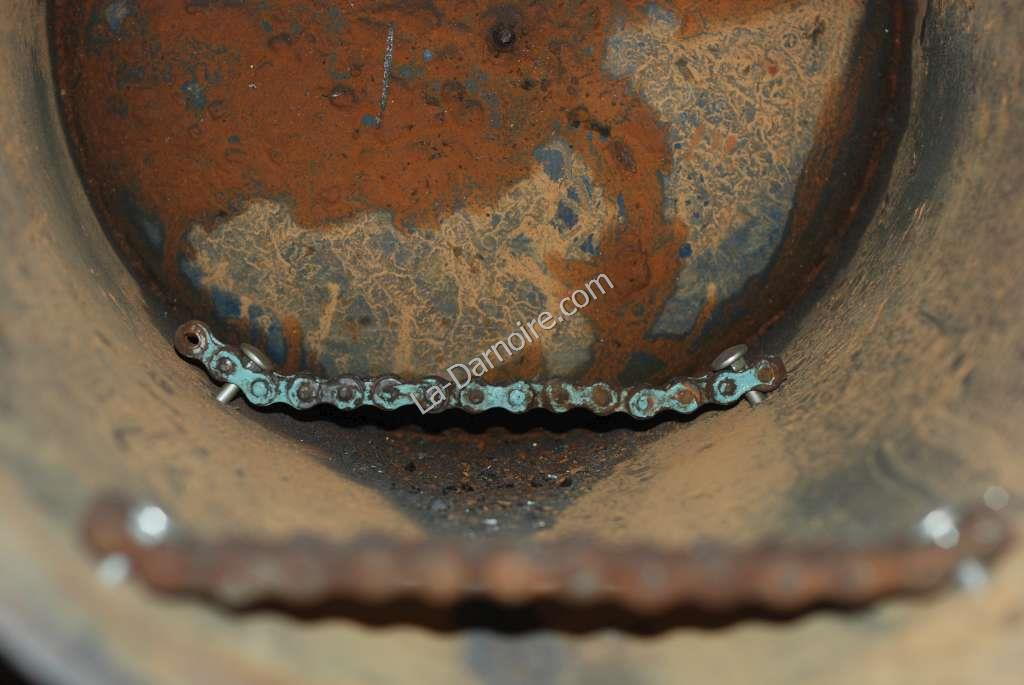 Using the bolts for the support brackets (which protrude into the woodstove), I installed the supports for the fire grate. In the scrap pile I had found some heavy-duty chain, similar to a motorcycle drive chain but with larger links. I bolted two sections of this in place at the bottom of the cylinder. A piece of heavy-duty wire mesh will rest on these supports, allowing air to flow through underneath the coals.