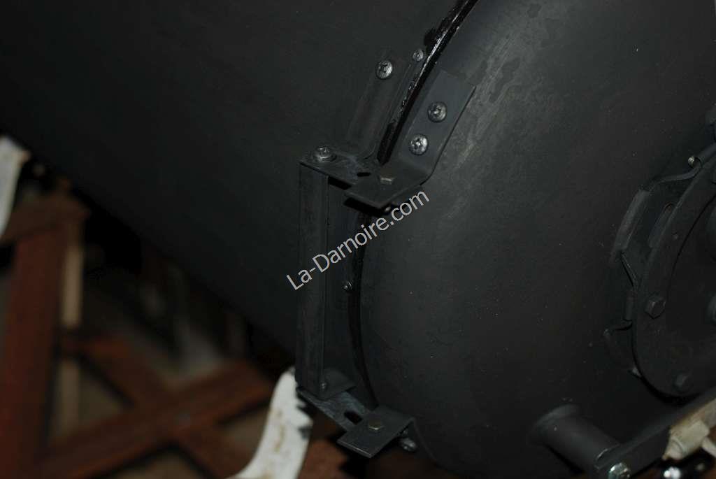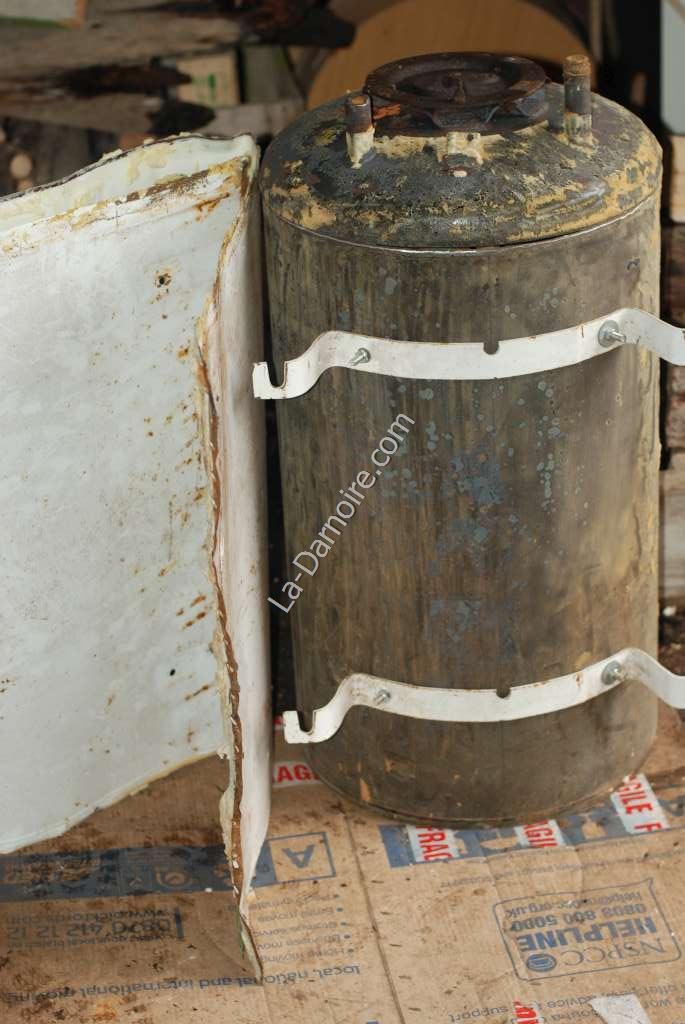 The first job was to remove the external shell, and then scrape off the polystyrene insulation. Once this had been removed, I re-fitted the brackets (the cylinder was originally designed to be used horizontally).