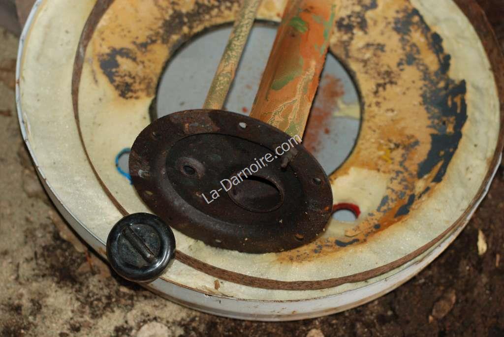 The next step was to remove the top of the cylinder. This was done by means of an angle grinder, cutting along the welded seam. I also removed the heating element and thermostat. The top of the cylinder will become the door of the wood stove. The larger hole left by the heating element will be closed with a small piece of glass so that the status of the fire can be checked, and the smaller hole left by the thermostat will be closed up. To provide a regulated airflow to the diy woodstove I will install a screw-type ceramic air vent taken from a small scrap woodstove (it was originally in the lounge but fell to pieces when we tried to move it! I kept the door latch for re-use, but the rest of the stove went on the scrap metal pile).
