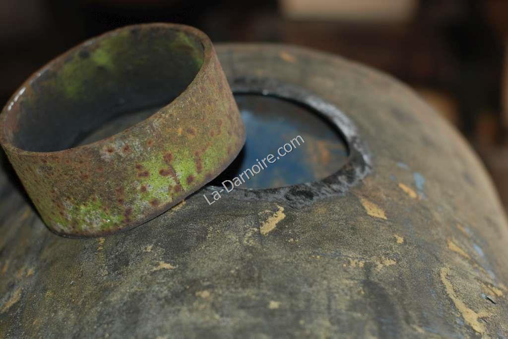 The door needed to close with some sort of seal. This meant it needed some sort of "lip" around the woodstove body. To form this, I used an appropriately-sized band of steel from an old oak barrel. This was fixed to the body of the woodstove with rivets. I then made a door handle by taking a carrying handle off an old wooden trunk, and bolting this to a metal bar on the door. You can see the ceramic airvent control underneath, and the glass viewing window above the handle.